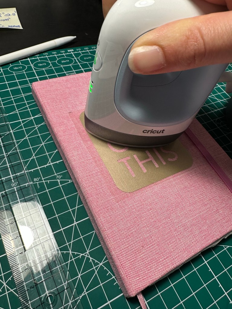 First, I connected my Cricut joy and chose the material I wanted to use for the project. I went for a golden HTV. Measured the area of the front cover, I pick the size for my design and make sure to update it in Design Space software.